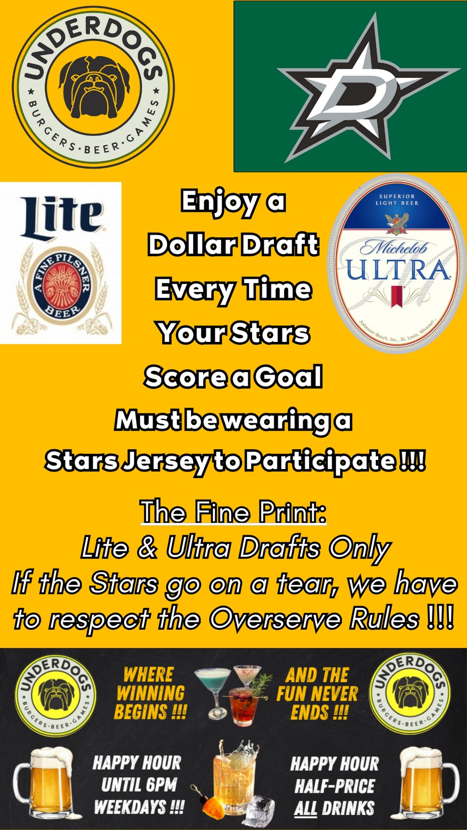 Every time your Stars score a goal, enjoy a Dollar Draft of Lite or Ultra !!! Must be wearing a Stars Jersey to participate, and if the Stars go on a tear, we still have to respect the overserve rules. But if they are winning, then we all celebrate - right ? See you at Underdogs, where the winning never ends !!!