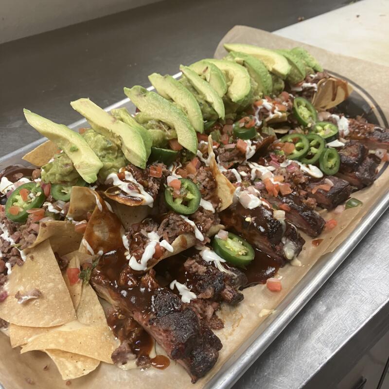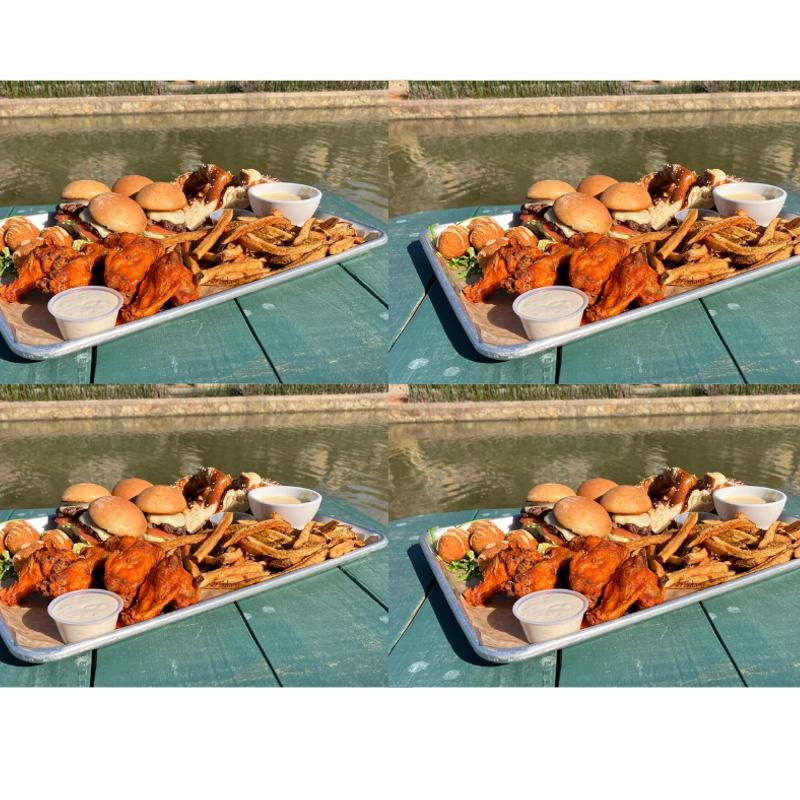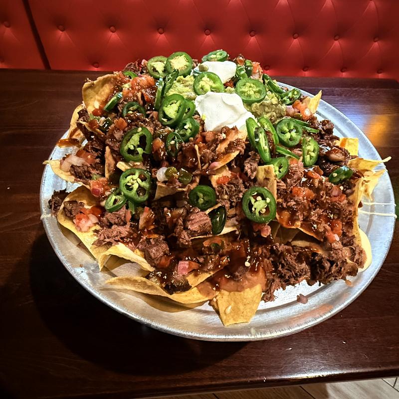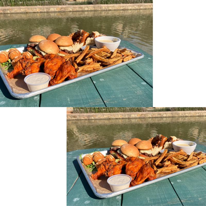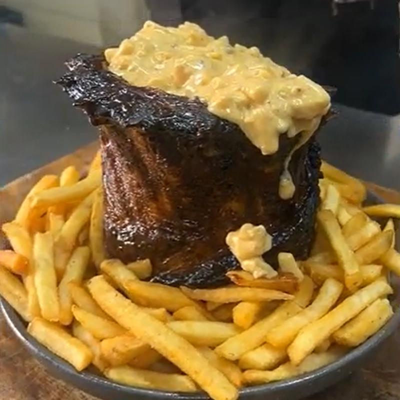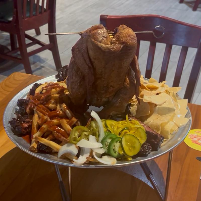 A Whole Beer Can Chicken, perfectly smoked to juicy perfection and artfully nestled at the center of a full rack of our tender, flavorful ribs. We then cover one hemisphere with House Fries while the other side boasts Chips and Queso. Topped off with all the classic fixin's, this dish is undeniably worthy of its own YouTube channel, but for now, it's a Local-Only exclusive! Delivered IKEA-Style (and no metal stand for the onion-rings - sorry ) so further assembly required !