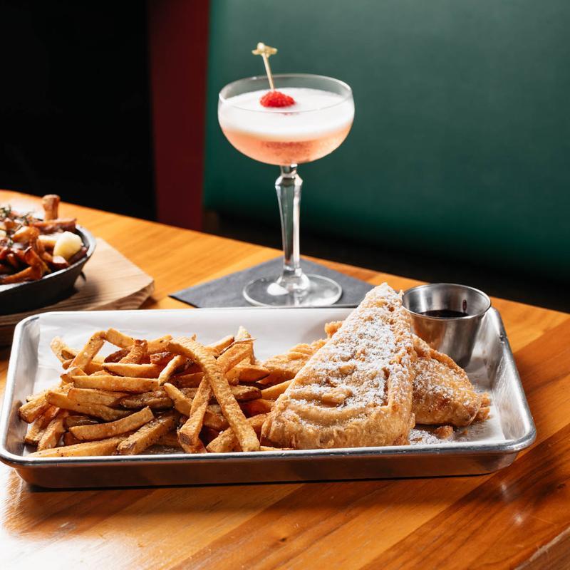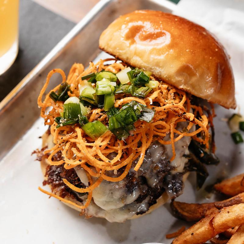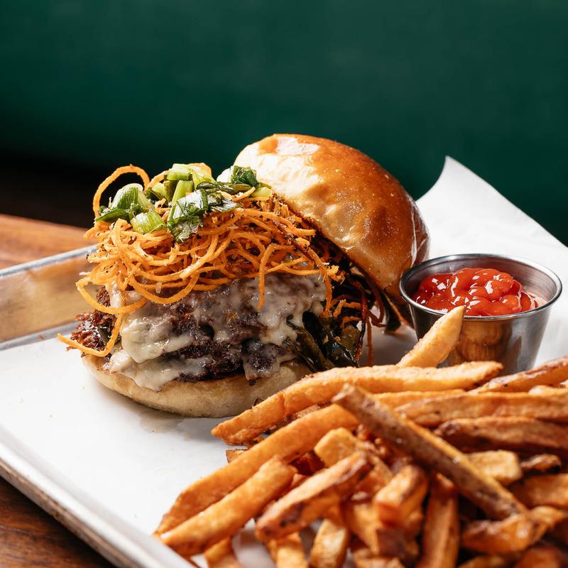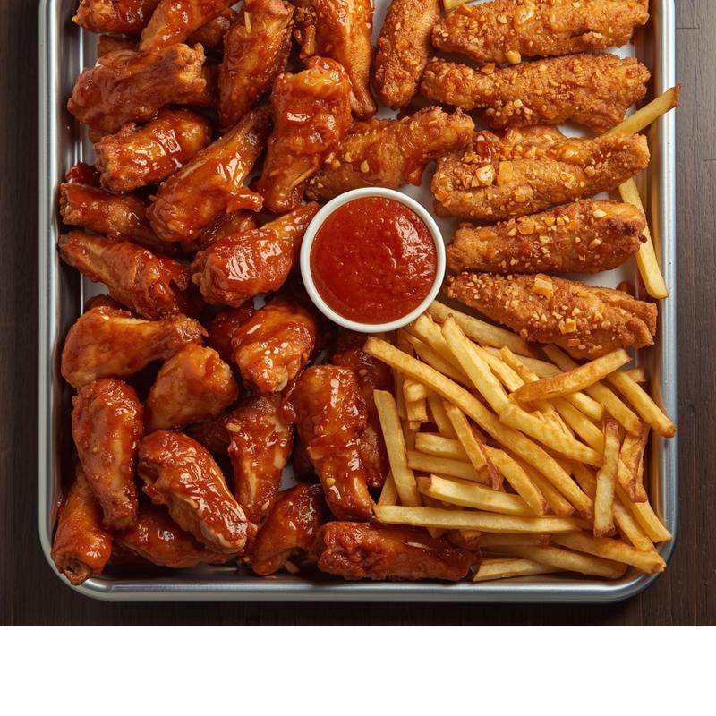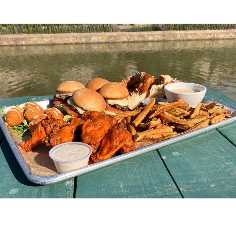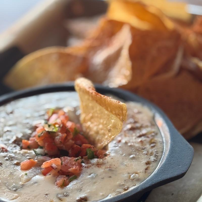 A Whole Beer Can Chicken, perfectly smoked to juicy perfection and artfully nestled at the center of a full rack of our tender, flavorful ribs. We then cover one hemisphere with House Fries while the other side boasts Chips and Queso. Topped off with all the classic fixin's, this dish is undeniably worthy of its own YouTube channel, but for now, it's a Local-Only exclusive! Delivered IKEA-Style (and no metal stand for the onion-rings - sorry ) so further assembly required !